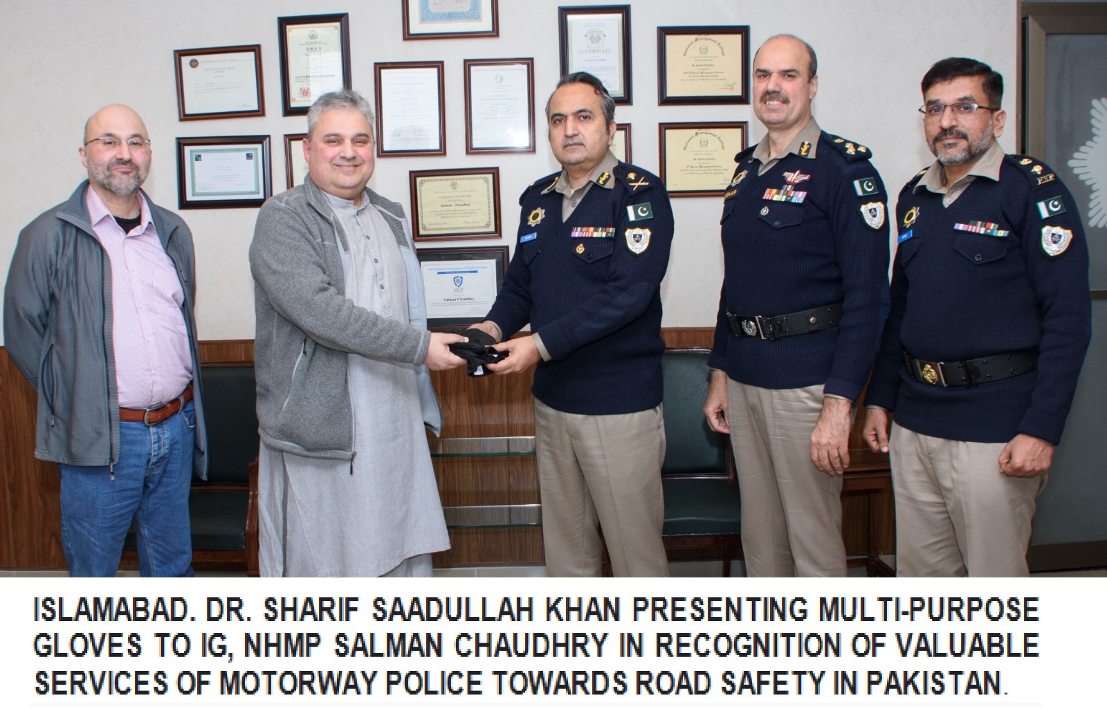 Dr. Sharif lauded efforts of Motorway Police in ensuring road safety on countrywide highways and motorways. He extended his acknowledgement by gifting 6000 multi-purpose gloves. “The dedication of Motorway Police is, undoubtedly, recognized nationally as well as internationally,” He said.